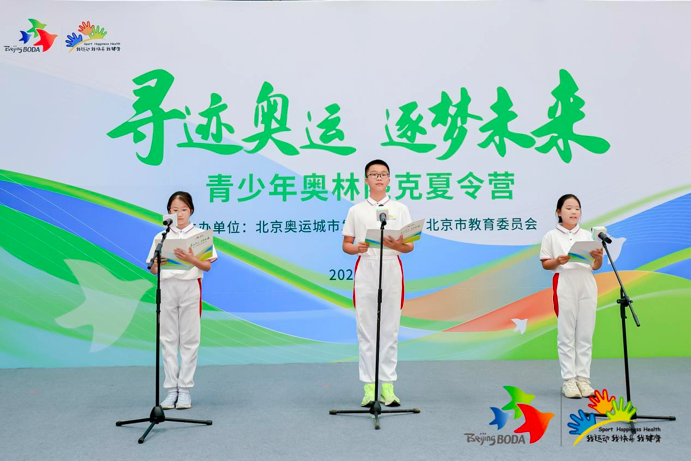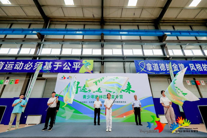 开营仪式上,学生代表朗诵了《体育颂》,主办方向参加夏令营的学校赠送了《探秘北京冬奥会》丛书。夏日红、钱进军、郭丽娜共同为参加夏令营的京津冀三地学校代表授予青少年奥林匹克夏令营营旗。