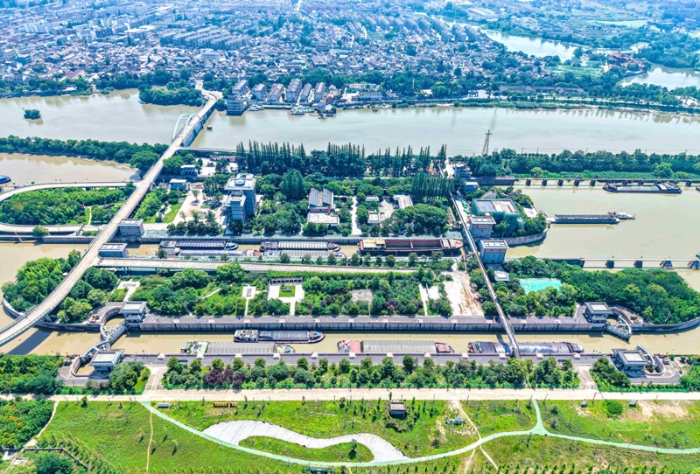 2025年7月4日,船舶有序通过京杭大运河扬州段邵伯船闸(无人机照片)。新华社发(任飞 摄)