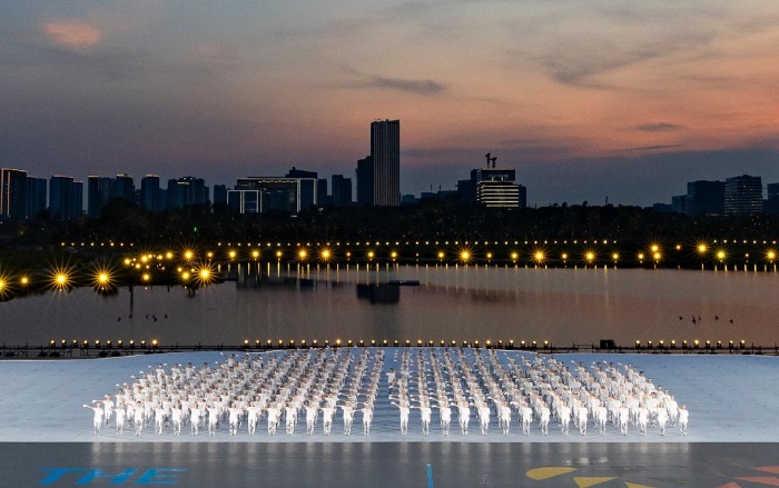 与传统体育场内的开幕式不同,总导演胡晓将舞台搬到了湖畔边。