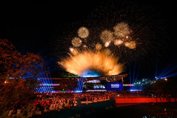 夜幕下的成都世园会成都国际友谊馆流光溢彩,屋顶中部的圆形天井与背后的山体、绿植有机融合,尽显“公园城市”的生态之美。来自世界各地的运动员相聚于此,场内歌舞飞扬、激情澎湃。