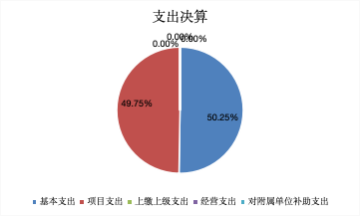 2024年度本年支出合计3711.88万元,比上年增加186.66万元,增长5.29%,其中:基本支出1865.39万元,占支出合计的50.25%;项目支出1846.48万元,占支出合计的49.75%;上缴上级支出0万元,占支出合计的0%;经营支出0万元,占支出合计的0%;对附属单位补助支出0万元,占支出合计的0%。