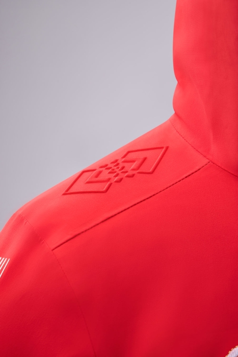本次领奖装备实现了“航天锁温棉”“玄武岩远红外”科技应用转化,内里结构进行了特殊处理,背部辅助使用拒水鹅绒,帮助运动员在赛后快速透湿并锁温,保持动态保暖。防护层采用能抵御暴雨级降雨的防水透湿膜,实现防风、防水、透汽透湿等功能。