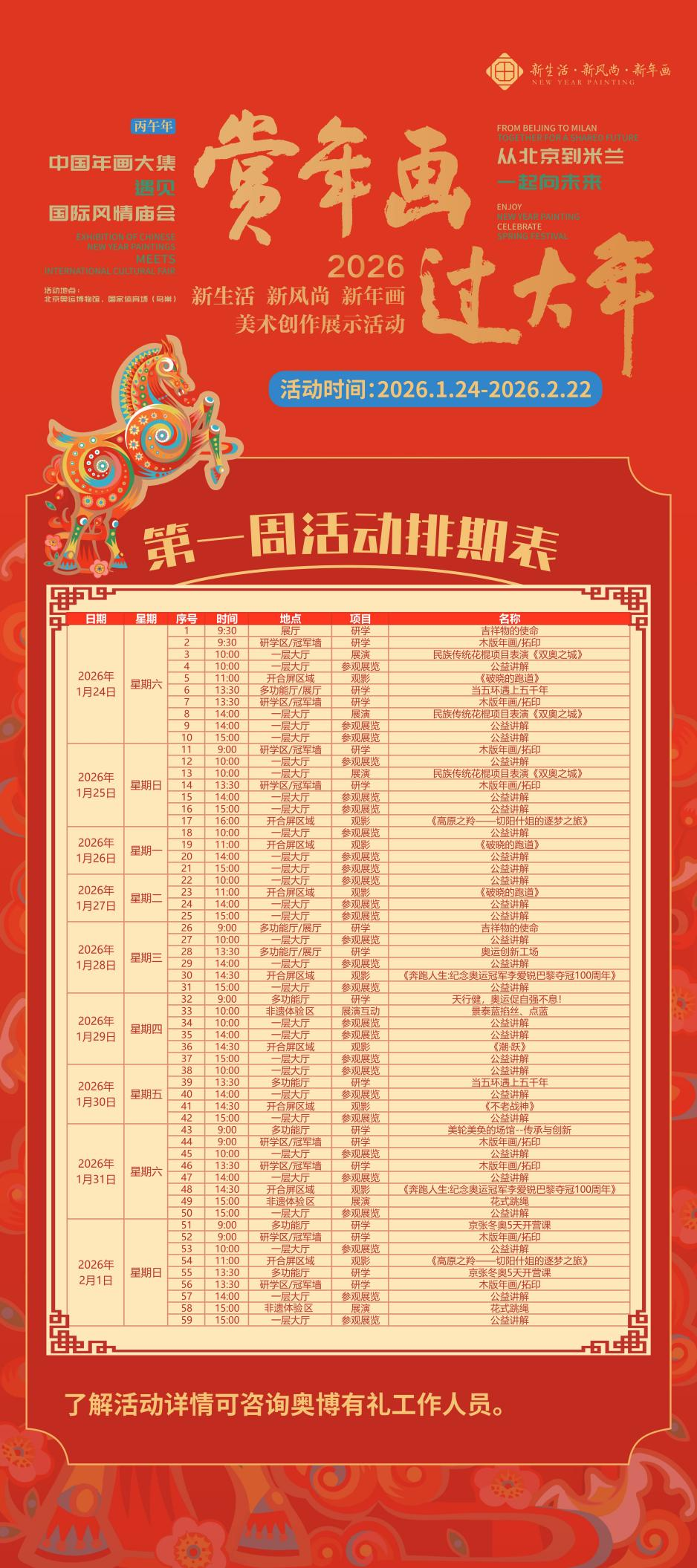 当2026年新春佳节邂逅米兰冬奥会,北京作为“双奥之城”再添文化盛事,奥林匹克中心区植入更多艺术元素。由北京奥运城市发展促进会、北京市文学艺术界联合会指导、北京奥运博物馆主办的“从北京到米兰一起向未来——中国年画大集・遇见・国际风情庙会”活动,将于1月24日(农历腊月初六)至2月22日(农历正月初六),在北京奥运博物馆、国家体育场(鸟巢)、奥林匹克中心区部分公共空间举办。本次活动与正在开放的第十五届鸟巢欢乐冰雪季相联动,包含“冰雪冬奥・意韵由你——从北京到米兰”冬奥嘉年华、“新生活·新风尚·新年画”作品展示活动、国际风情庙会三大核心部分,以多元业态打造新春文化消费新场景,为首都市民献上兼具冬奥激情、传统年味与国际风情的节日盛宴。