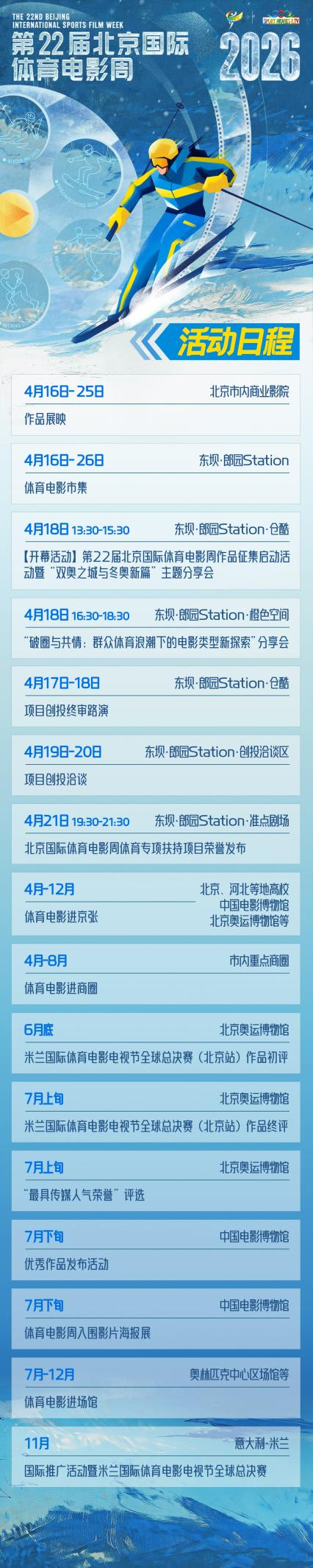 第22届北京国际体育电影周将于4月18日在北京市朝阳区东坝·郎园Station正式启动。本届电影周以"影像中的奥林匹克"为主题,由北京国际电影节组委会、中国奥林匹克委员会与北京奥运城市发展促进会联合主办,以米兰·科尔蒂纳冬奥会为契机,深化中意两国体育影视文化的对话与交流。主体活动贯穿4月至7月,于北影节期间率先启幕。从开幕分享会到作品展映,从项目扶持到公益联展,一场关于体育与影像的完整对话,即将展开。